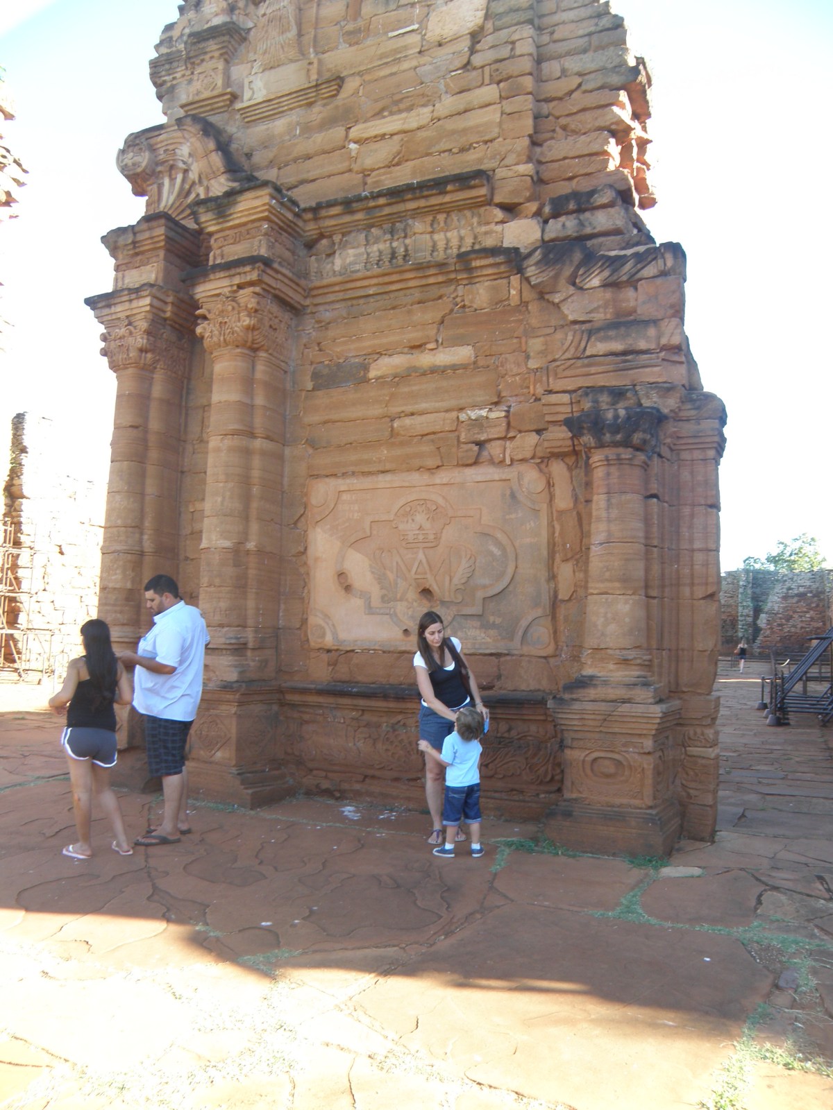 El sábado Filipe trabajó hasta las 13 h. Hacía mucho calor cuando finalmente partimos y la salida de Posadas fue muy complicada por el tráfico. En Misiones, la policía parecía mucho menos preocupada con los controles. Llegamos a las ruinas de San Ignacio cerca de las 15 h y preferimos almorzar algo antes de entrar. Después de pasar la entrada, hay un Centro de Interpretación muy interesante y necesario para entender cómo funcionaban las misiones jesuíticas. Gonzalo y Agus protestaron todo el tiempo. Poco les interesaba todo lo que estaban viendo. Intenté explicarte a Gonzi pero le encantó la idea de los indios y me hizo 250 preguntas. Justo empezó el guía a hacer su presentación, pero Gonzi insistía en preguntar. Era complicado prestar atención y responderle al mismo tiempo. Sobre todo cuando llegamos a la parte en que preguntaba si podía ver a los indios, dónde estaban, dónde están las flechas.El paseo duró una hora y uno se queda con ganas de más, pero el calor era agotador y todavía teníamos muchos kilómetros hasta Foz de Iguazú.