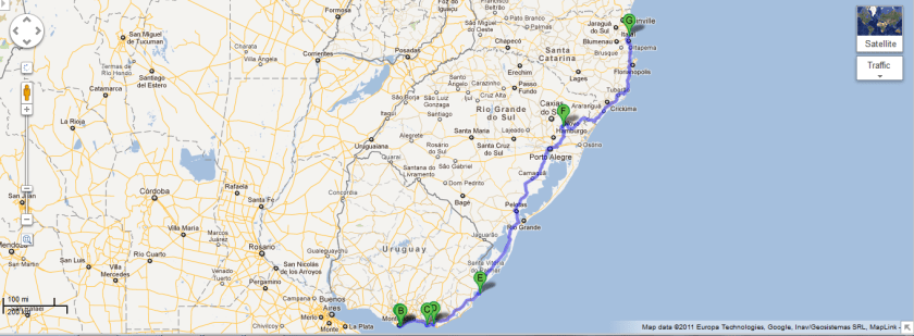 Mañana debemos recorrer casi 500 km (Del punto F al G). Próximo destino: Penha, en el estado de Santa Catarina.